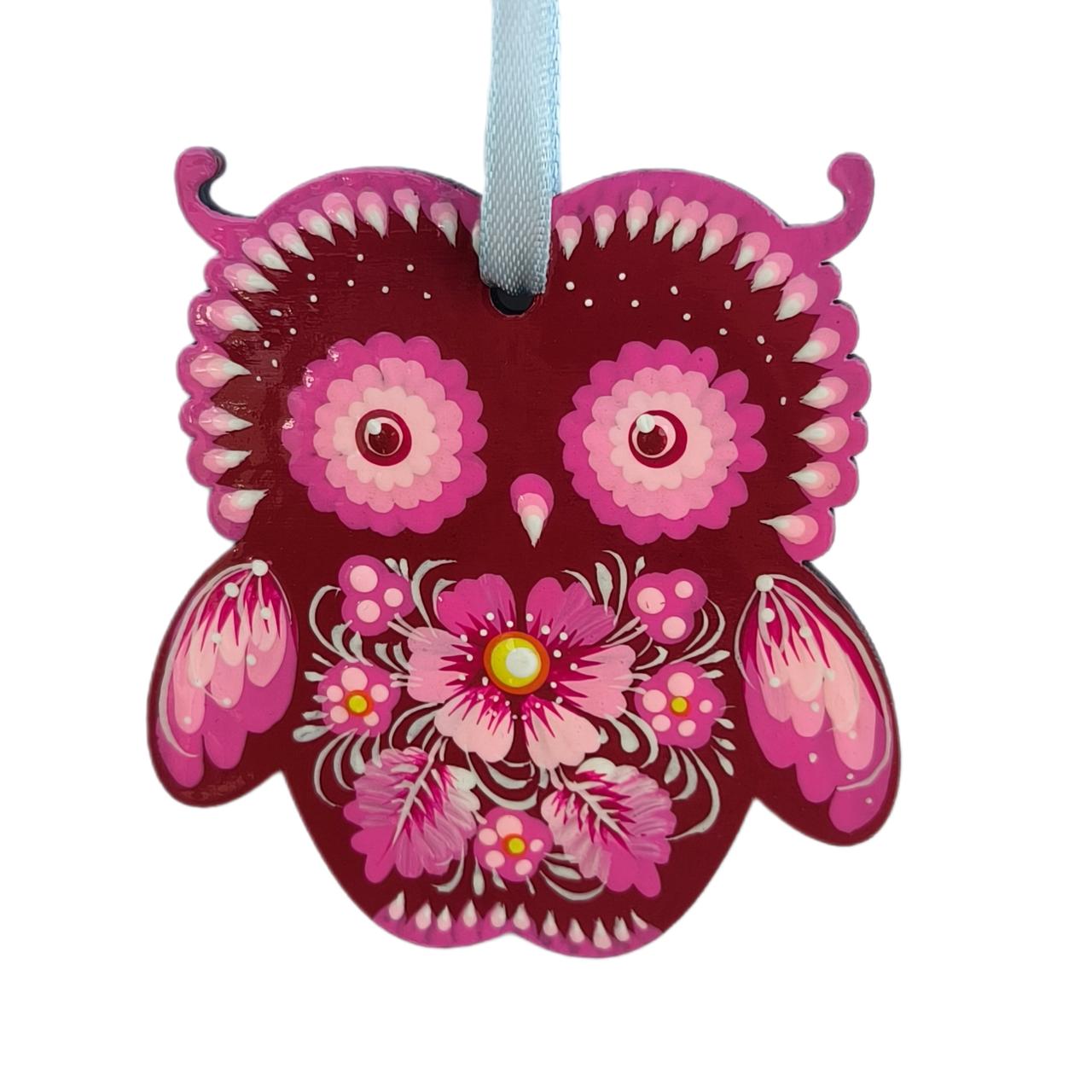 Фанерна підвіска "Сова, бордова" 7,5*8 см., з петриківським розписом, ручної роботи.